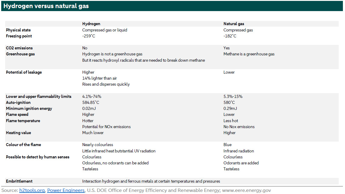 We start with specific characteristics of hydrogen and compare it to its main substitute, natural gas. Taking these characteristics into account, we can determine whether hydrogen can be transported via the existing gas infrastructure. Important characteristics are combustion, greenhouse gases, leakage risk and volume.