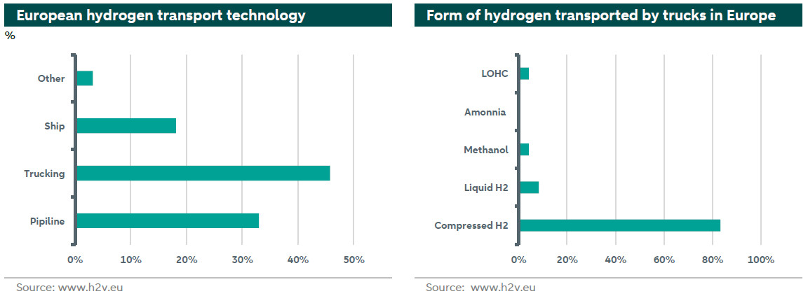 Hydrogen can be transported in a gaseous state in high-pressure containers or in a liquid state at a cryogenic temperature in thermally insulated containers. Almost 97% of the green hydrogen transported through pipelines comes in a compressed hydrogen form.