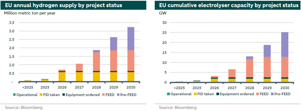 In 2024 the EU is expected to produce 0.04 million metric tons of green hydrogen (BloombergNEF). Based on current list of projects under different development statuses, the total forecasted supply for the EU in 2030 is 3.2 million metric ton per year associated to 25.2 GW of accumulated capacity as illustrated in the charts below, of which only 2.6 GW are operational or reached the Final Investment Decision (FID) stage. This means that current (planned) hydrogen development falls short by 14.8 GW of targeted installed capacity. Furthermore, as the charts clearly show, most of the projects are in the Front-End Engineering Design (FEED)(1) or Pre-FEED stages, which still incorporate high uncertainty whether these project will actually materialize.