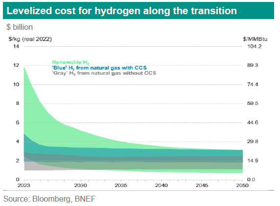 Green hydrogen is produced through a chemical process known as electrolysis and in order to be labelled as green, only renewable energy sources should be used. Electrolysis uses an electrical current to separate hydrogen from oxygen in water. As the electricity used is from renewable sources, such as solar or wind energy, no carbon dioxide is emitted during the production into the atmosphere. But green hydrogen is also very expensive compared to blue hydrogen (generated from natural gas with carbon capture and storage) or grey hydrogen (uses natural gas without carbon capture and storage). The graph below on the next page shows the different levels of levelized costs for green, blue and grey hydrogen. For green hydrogen to become a viable option from a cost point of view, the costs would need to decline substantially.