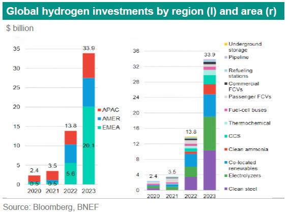 Globally, hydrogen investments are gaining momentum with global investments of hydrogen related areas amounting to $34 billion in 2023. That translates to a rise of 246% compared to 2022, see graph below (more ).