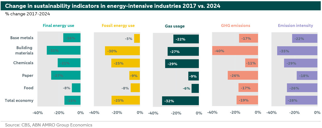 The above overview shows that companies in these sectors have clearly taken steps towards decarbonisation. In all sectors, the change in the indicators over the period 2017-2024 has a positive effect on climate targets. The building materials industry shows the best results across the board, with the strongest decreases of all energy-intensive industrial sectors in the period 2017-2024 in final and fossil energy consumption, GHG emissions, and emission intensity. This is also true in relation to the economy as a whole. The chemical industry is also showing good results. However, it is striking that GHG emissions are declining less rapidly than the other indicators. This is because this industry emits a wider range of greenhouse gases than the other sectors. A reduction in fossil energy and gas consumption mainly relates to CO2 emissions. The food industry has more difficulty reducing energy and gas consumption. This is because this sector is much more dependent on gas in the production process than other sectors. As good alternatives are not yet readily available on a large scale, this makes the transition in this sector more complex. The basic metals industry—particularly steel production—faces a similar problem, as this sector is still highly dependent on the consumption of coking coal for steel production.