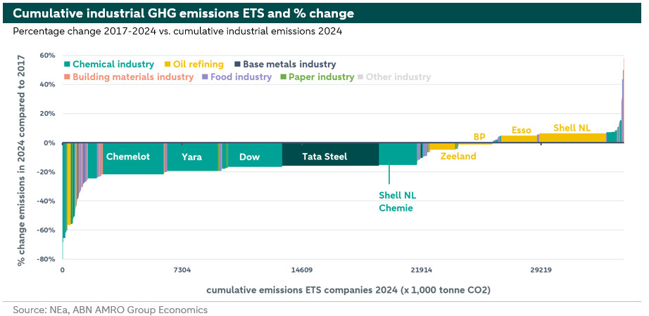 The vertical axis shows the percentage change in CO2 emissions in the period 2017-2024 (the post-Paris Agreement period). For the companies on the far right of the figure above the horizontal axis, emissions have increased, while for the companies on the left of the figure below the horizontal axis, emissions have decreased. By doing so, an EU ETS decarbonisation curve for Dutch industry emerges. The large chemical companies (including Chemelot, Yara, Dow, and Shell NL Chemie) and a number of smaller installations have reduced their GHG emissions, while on the right side of the figure there are still a significant number of chemical companies that have not succeeded in doing so. All 40 companies whose GHG emissions increased in the period 2017-2024 together account for 23% of these industrial ETS emissions. The remaining 137 companies have been more successful with their climate measures.