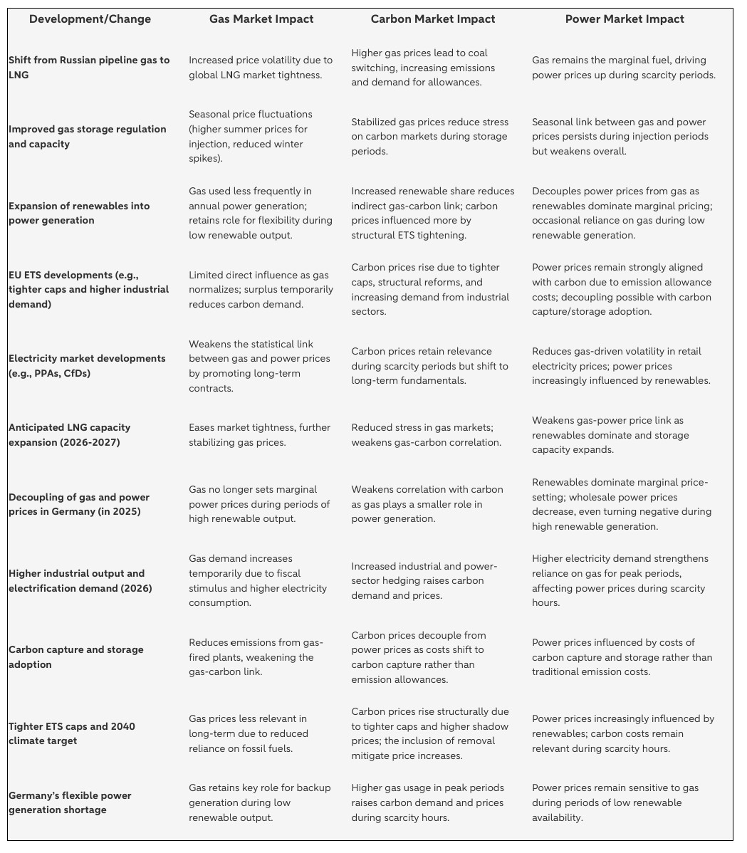 ETS tightening and the 2040 climate target are strengthening the structural role of carbon in guiding investment and dispatch decisions, while market design reforms and gas security measures are minimizing the direct and continuous impact of gas price shocks on power and retail prices. This creates a more nuanced system: during scarcity hours, power prices will continue to strongly align with gas and EUA prices. However, as the share of low marginal cost renewables grows and long-term hedging instruments expand, the traditional gas–carbon–power triangle will gradually lose its influence as the primary driver of European power price formation. The table in the following page summarizes the impacts of several regulatory and market developments on the three markets.