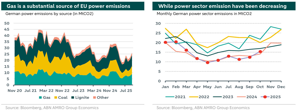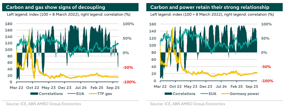 The European carbon market is affected by changes in other energy markets, either directly through the use of fossil fuels in heating and manufacturing, or indirectly through electricity production. The relationship between the gas and carbon markets has been particularly notable in recent years, with a strong correlation between gas and carbon prices during the energy crisis and thereafter. The left chart above highlights the strong correlation between gas and carbon prices during extended periods following the energy crisis. Stress in the gas market with tight supply, combined with weather uncertainty, drove carbon prices higher. However, signs of decoupling between the two markets have recently started to emerge. As gas market tightness began to ease over the summer due to steady LNG imports, favourable weather, and anticipated LNG capacity expansions in 2026. If gas prices continue to decline, this correlation could potentially reverse as lower gas prices could reduce emissions and demand for allowances.