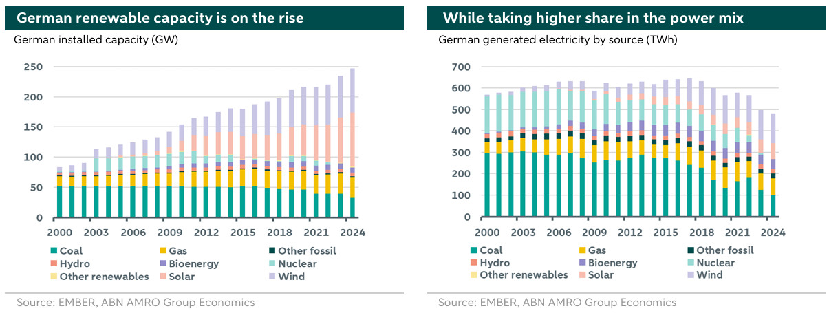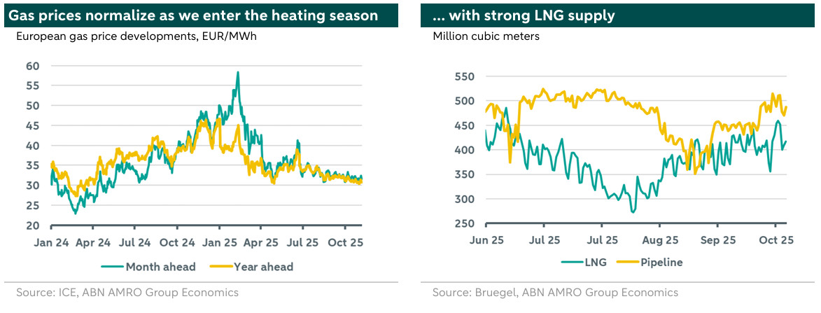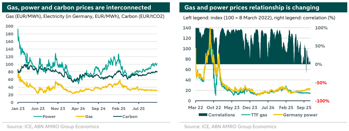 At the same time, the right graph above clearly shows a weakening in the correlation between gas and power prices this year. The decoupling of gas and power prices in Germany in late 2025 is largely driven by structural changes in energy generation, decreasing electricity demand, and the increasing influence of renewables. In early October 2025, record-breaking solar and wind generation significantly lowered wholesale power prices, even causing them to turn negative at times. This high renewable output has shifted the marginal price-setting from gas-fired plants to renewables, disrupting the traditional link between gas and electricity prices. At the same time, the gas market is witnessing a start of normalization after years of tightness, supply uncertainty, and high volatility as new LNG capacity is in the horizon. With electricity consumption dropping and TTF gas prices remaining stable, the correlation between power and gas markets has weakened considerably.