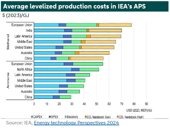 The chart above shows the average levelized production costs across regions (left) under the IEA’s Announced Policies Scenarios (APS). The EU has the highest cost for producing ammonia in the world mainly because of high costs of electricity, followed by North Africa with highest CAPEX costs. But there are cost competitive countries in the EU. At the same time, ammonia ranks lowest as a transport marine fuel with the highest transport cost and lowest energy density compared to other alternative fuels.