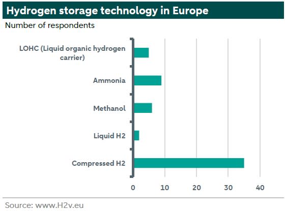 The challenges around using ammonia for storage purposes are reflected by its low adoption in current hydrogen projects. Within a survey among hydrogen valleys in Europe, almost 22% of respondents identified ammonia as a key technology to store produced hydrogen. However, 85.4% of respondents (41 respondents) are storing hydrogen in a form of compressed hydrogen.