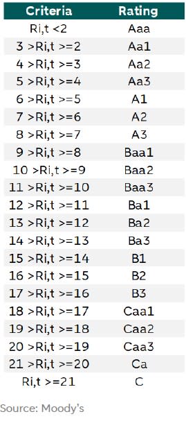 Since rating assignments typically rely on non-linear models and probabilities, we model Rit (correct writing in table above) based on the odds of the issuer being classified into a specific category. Therefore, Rit will represent the log(odds), where the odds reflect the probability of the issuer receiving a higher or lower rating, determined by factors such as its macroeconomic performance, political stability, and others (details discussed further below).