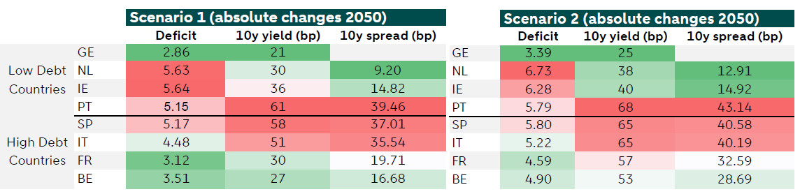 Based on these results, and incorporating our projections on countries’ deficit levels, the tables below suggest potential outcomes from the impact of acute physical risks on European government deficits, bond yields, and country spreads in the long term. We have calculated the results for two different climate scenarios, one assuming 1.5°C global warming (scenario 1) by mid-century and one assuming 2.0°C (scenario 2). In terms of deficit impact, the Netherlands, Ireland, Portugal, and Spain are the most affected across all scenarios. This aligns with our previous research (see here), which found that countries in the southern part of the EU are the most vulnerable to acute physical risks in the short-term but that these risks increasingly spread towards the Atlantic countries in the western part of the EU, due to their heightened vulnerability to acute flooding episodes in the longer term.