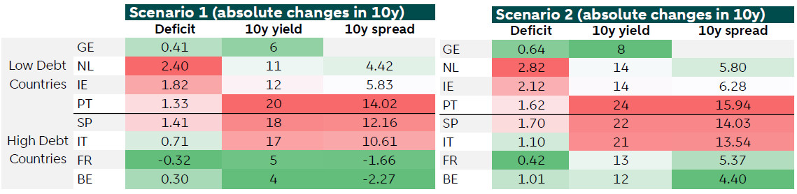 The relationship between a country’s budget balance and its government bond yields (specifically long-term bond yields) can vary significantly across different countries within the eurozone and tends to be non-linear. Research often indicates that an increase in the fiscal deficit could lead to an increase in yields by anywhere from several basis points (bps) to potentially over 20bps or more. This is because larger deficits may raise concerns about a government's long-term debt sustainability, as more government bond issuance needs to be absorbed, and also tend to raise inflation expectations, which lead investors to request a higher risk premium to buy those government bonds. Of course, there are other key factors that affect countries’ borrowing cost such as market confidence, central bank actions, economic and political conditions.