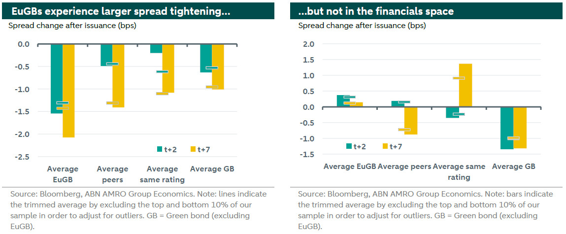 The chart above on the left shows that indeed, as expected, green bonds outperform in the secondary market. Their spread tightening is, on average, 0.6 bps two days after issuance, compared to 0.5 bps for all bonds in our sample. However, what’s new is that EuGBs experience a much larger spread tightening than regular green bonds. This tends to be 1.6 bps on average two days after issuance and 2.1 bps seven days after issuance. The outperformance of EuGB vis-à-vis other bonds and other green bonds are present when looking at SSA and corporate issuers. However, such trend is less visible when looking at financials (bank bonds). In this case, the EuGB has actually, on average, a slight underperformance in secondary markets, while green bonds have experienced spread tightening (see right chart above). This is in line with findings for the primary market.