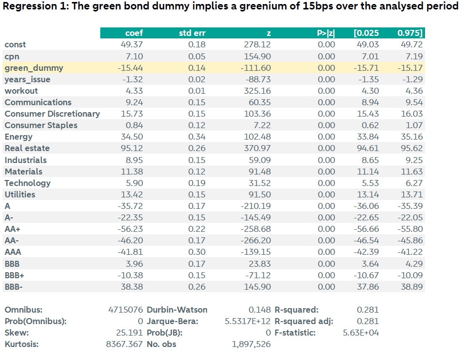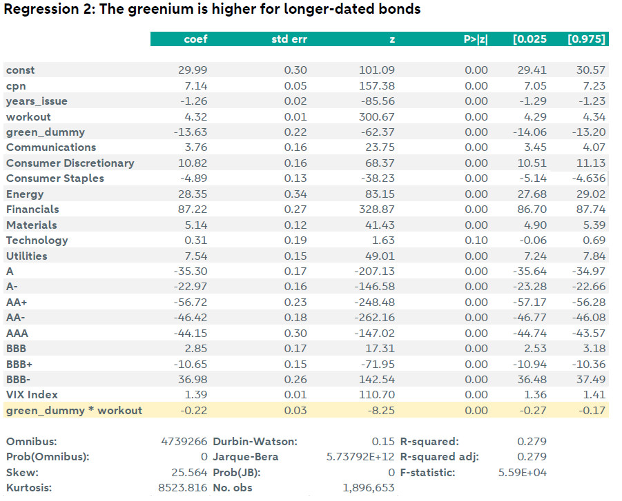 We note that our regression model does not yield a significant R-square, which is likely explained by the fact that likely spreads are being influenced by other variables rather than rating, sector and years to maturity. However, a low R-square does not impact our coefficient, as we do not foresee the risk of omitted variables that correlate with our green dummy.