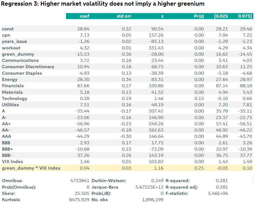 We do this by adding two new variables to our model: the VIX Index (which we use as proxy for market volatility) and an interaction term between green bonds and volatility. We find out that, as expected, the higher the market volatility, the wider the credit spreads, all else equal. The interaction term has a slightly positive coefficient of 0.04bps in our regression, which would indicate that green bonds are slightly more sensitive to volatility. That is, for every 1-unit increase in volatility (VIX), the effect on credit spreads for green bonds is 0.04bps higher than the effect for non-green bonds. However, a 0.04bps impact is an unsignificant amount, implying that we can comfortably conclude that volatility has no impact on the greenium. To add to that, and more importantly, the interaction term is also statistically insignificant.