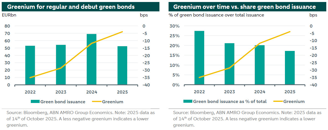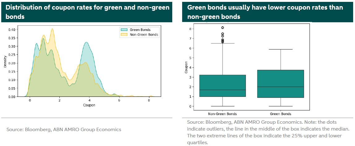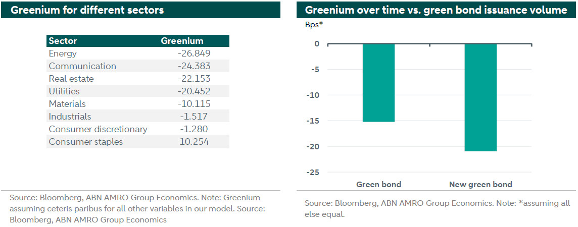 • Longer-dated bonds show a slightly larger greenium, but the increase is limited to only 0.2bps per each additional year to maturity