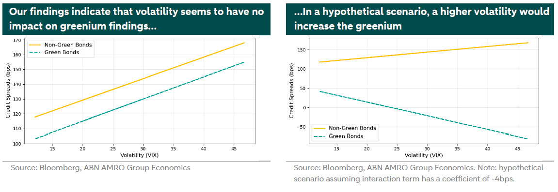 The chart on the next page on the left illustrate our findings. As it is possible to see, there is no additional impact on green bond spreads vis-à-vis non-green bonds spreads of higher volatility. If there would to be any impact, we would expect both curves to have a different slope. That hypothetical scenario is illustrated on the right-hand chart below. In this scenario, were the interaction term has a manually set coefficient of -4bps, we can clearly see that the greenium (the difference between green bond spreads vs non-green bond spreads) increases with volatility.