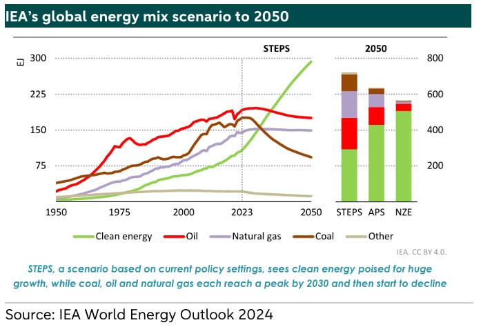 According to the IEA's latest outlook , in the STEPS scenario, clean energy deployment accelerates while the overall pace of energy demand growth slows, leading to a peak in all three fossil fuels before 2030. With increasing reductions in coal demand, natural gas overtakes coal in the global energy mix by 2030. Between 2023 and 2035, clean energy grows more than the total energy demand. Driven by a surge in solar photovoltaic (PV) and wind power, clean energy becomes the largest source of energy by the mid-2030s. Consequently, STEPS envisions a threefold increase in renewables, reducing the share of fossil fuels from 80% of total energy demand in 2023 to 58% by 2050.