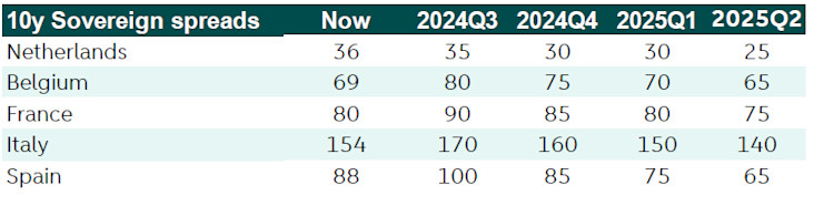 Indeed, our base scenario sees an incoming RN government adjusting its current political program to a certain degree to avoid market turbulence. We would still expect fiscal slippage, particularly as this government is unlikely to engage into fiscal consolidation in the upcoming three years. Thus, it is now very unlikely to see France’s deficit reach the 3% target by 2027 as previously planned by the current government. This represents a difficult balancing act for the RN as on one hand, they will need to satisfy their electorate after promising so much over the past years but on the other hand, not trigger a debt crisis as this would lead to important economic impact and ruin their chance of winning the presidential election in 2027. Thus, as political uncertainty fades and the RN government translates its recent reasonable political speech into a cautious economic program, we expect spreads to stabilize and tighten later in the year (see table below). However, we continue to see France slightly underperform its EGB peers given the country’s political divisions and its deteriorating fiscal and debt outlook. This could push France trading closer to lower-rated countries and be considered as a sort of “crossover peripheral”. In our view, this offers attractive opportunities for investors interested to come back to the European debt market once the political uncertainty fades. This is indeed a good opportunity to buy the debt of certain sovereigns with a good economic fundamentals (i.e Spain or Portugal) at a cheaper levels than a couple of weeks ago.