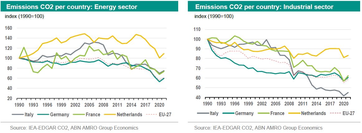 The energy transition is now well underway in many EU countries and their largest climate sectors, only the pace of this transition is in many cases still too slow. Often, it is only exogenous shocks that trigger substantial CO2 reductions in countries, while a structurally fast-enough reduction pathway still seems far away. Between EU countries, however, we see differences in this. Not only the trends of countries' CO2 emissions differ, but also we notice strong variations in the reduction path in the different climate sectors per country.