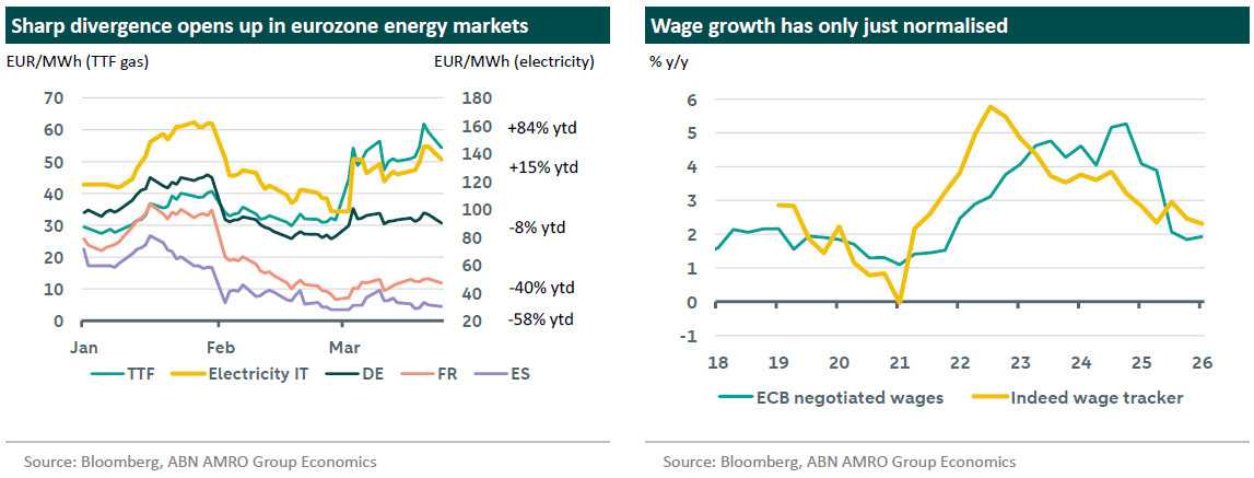 In this Monthly we made the first changes to our base case following the outbreak of the Iran conflict almost a month ago. While much remains uncertain over the final extent and length of the energy shock that is unfolding, two things are clear, at least for Europe: 1) the shock is unlikely to be nearly as large as the 2022-23 energy crisis that resulted from Russia’s invasion of Ukraine, and 2) it will not hit eurozone economies as uniformly as back then. The clearest indication of this is in the reaction in electricity prices to the rise in natural gas prices. While gas prices have risen some 80% year to date, average wholesale electricity prices for the 5 biggest eurozone economies have barely moved since the conflict broke out, and are still some 14% lower year-to-date (largely due to the collapse in the carbon price).