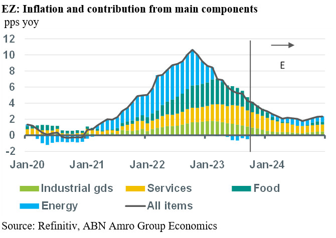 Eurozone headline inflation fell to 4.3% in September, down from 5.2% in August, while the core rate decreased to 4.5% from 5.3%. The drop in core inflation was larger than our own below-consensus forecast of 4.6%. The decline in the headline rate was also bigger than we expected, mainly because energy price inflation fell (to -4.7%, down from -3.3% in August), whereas we had expected a rise in energy inflation on the back of the recent rise in oil prices. The detailed national inflation reports suggest that the inflation rate of car fuel did indeed increase in September due to the rise in oil prices, but this was more than offset by further drops in household energy inflation (gas and electricity). As we have mentioned before, the change in household energy inflation is still being impacted by the (unwinding of a) wide variety of government support measures in different countries since the start of the war in Ukraine. This will continue to impact household energy inflation for the rest of this year and in the first half of 2024. The inflation rate of food, alcohol and tobacco also declined in September (to 8.8% from 9.7% in August). We expect food price inflation to continue to ease in the coming months, but we no longer expect outright declines in food prices (also please read our latest ), implying that the inflation rate of food will fall to levels close to zero during the first half of 2024.