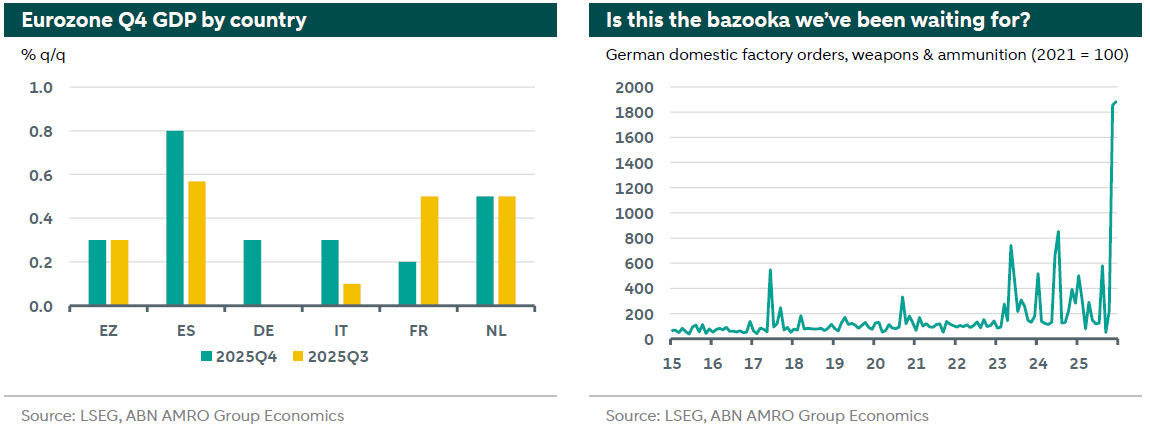 Eurozone GDP surprised to the upside in Q4 at 0.3% q/q, above our (0.1%) and consensus (0.2%) forecasts. Incoming data had already suggested strength in the domestic economy, but we expected net exports to have been more of a drag. Full details for the eurozone aggregate will be released next week with the 3rd estimate, but piecing together the details from individual countries suggests that household consumption and government spending were significant drivers of growth in Q4, while net exports were indeed a drag in most countries – with some exceptions such as the Netherlands and France (the latter largely due to falling imports). Looking at country level data, GDP growth was particularly strong again in Spain (0.8% q/q), while France was surprisingly solid (0.2%) considering this came after an already very strong Q3 (0.5%). This suggests the private sector appeared to shrug off the uncertainty surrounding the 2026 budget wrangles.