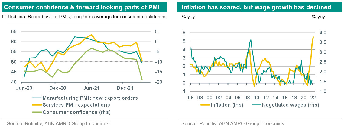 Just as the eurozone economy was bouncing back from COVID-related restrictions in February, the escalation of the Russia-Ukraine conflict seriously clouded the economic outlook. Around 40% of Europe’s gas imports are from Russia and around 25% of its oil imports. In addition, Russia and Ukraine are significant suppliers of other commodities and intermediate goods that are essential inputs for Europe’s industrial sector. Indicators of activity and sentiment have dropped sharply lower following the outbreak of the conflict. For instance, the forward-looking parts of the PMIs and consumer confidence plummeted in March (see graph), with consumer confidence falling almost to the low point that was registered during the first wave of the pandemic. Indeed, we expect soaring energy prices will result in only moderate consumption growth in the first half of this year, despite the post-lockdown rebound in services consumption. Moreover, indicators for Germany’s industry have collapsed, with the Ifo business climate in industry falling at a record pace in March. The drops in these eurozone indicators look to be in line with our base scenario for the economy of modest quarterly growth (of around 0.3-0.4% qoq) in the first half of this year, which is below the consensus forecast and also below the ECB’s most recent projections.