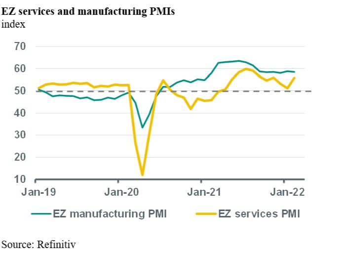 The details of the PMI report provided some interesting insights. To begin with, the decline in the EZ manufacturing PMI in February was due to an improvement in the component that measures the suppliers’ delivery times, which has a negative sign in the index. For instance, in Germany the component measuring the suppliers’ delivery times in the manufacturing PMI improved by 7 points, suggesting that supply bottlenecks, although still present, are gradually becoming less severe. The same story holds for the input price index in eurozone manufacturing, which still is at a historically high level but declined by almost 2 points in February, implying prices are still rising, but at a slower pace. The output price index in manufacturing edged lower as well in February, suggesting that some of the price pressures in industry are gradually easing. Indeed, we expect them to recede significantly later in the year. In contrast, the input and output price indices in the services sector each increased in February, in line with the unwinding of containments measures and re-opening in large parts of the sector. We think that the normalisation of services sector activity and prices will keep core inflation in the eurozone elevated in the first half of this year, but that services inflation will gradually decline from around the middle of this year onwards.