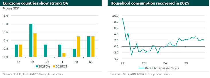 Eurozone GDP surprised to the upside in Q4 at 0.3% q/q, above our (0.1%) and consensus (0.2%) forecasts. Incoming data had already suggested strength in the domestic economy (see ), but we expected net exports to have been more of a drag. We do not have the full details for the eurozone aggregate, but piecing together the details from some individual countries suggests that household consumption and government spending were significant drivers of growth in Q4, while net exports were a drag in most countries – with some exceptions such as the Netherlands (see below) and France (the latter largely due to falling imports). Looking at country level data, GDP growth was particularly strong again in Spain (0.8% q/q), while France was surprisingly solid (0.2%) considering this came after an already very strong Q3 (0.5%). This suggests the private sector appeared to shrug off the uncertainty surrounding the 2026 budget wrangles.
