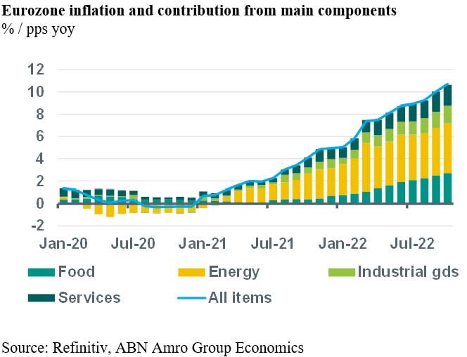 Eurozone inflation came in well above the expectations again in October. Headline HICP inflation increased to 10.7%, up from 9.9% in September, with the core rate rising to 5.0% up from 4.8%. Again, food and energy price inflation were the main drivers behind the rise in inflation. Indeed, the inflation rate of processed food, alcohol & tobacco increased to 12.4%, up from 11.5% in September and the inflation rate of unprocessed food jumped to 15.4%, up from 12.7%. Energy price inflation increased to 41.9%, up from 40.7%. A further breakdown of energy inflation from more detailed national and local inflation data suggests that household energy price inflation (electricity and gas) again increased in October, whereas transportation energy price inflation, which is closely linked to changes in global energy commodity prices, declined. Based on trends in global food and energy commodity prices in recent months, we think that eurozone food and energy price inflation should peak soon and will start declining in the coming months. This should also result in total inflation moving lower, but probably at a slower pace than the food and energy components, as core inflation probably is more sticky. The breakdown of the main components of core inflation in October, shows that services inflation edged higher to 4.4%, from 4.3% in September, and that the inflation rate of non-energy industrial goods accelerated more significantly, to 6.0%, up from 5.5%. The rise in non-energy industrial goods inflation no longer seems due to global supply chain bottlenecks, which have become less severe since the start of the year, but now seems mainly related to the pass-through of high energy prices, combined with euro weakness. This pass-through tends to be sluggish and can continue for some months after global energy commodity prices have peaked. All in all, we still think that eurozone inflation is close to its peak level and will start declining in the coming months. Meanwhile, the new jump in inflation moving into Q4 means that household real disposable income will have eroded further, which bodes ill for economic growth in the final months of the year.