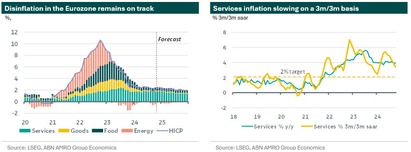 Inflation and firmer GDP put 50bp discussion on hold – Following yesterday’s firmer than expected eurozone GDP release (read here) and today’s inflation print, the discussion of whether the ECB should accelerate the pace of rate cuts from 25bp to 50bp, as was suggested by some governing council members in Washington, seems to be put on hold for now. Indeed, we stick with our view that the ECB will cut interest rates by 25bp at the December meeting. In 2025 we expect the ECB to continue cutting interest rates by 25bp at each meeting until neutral levels (1.5% in our view) are reached.