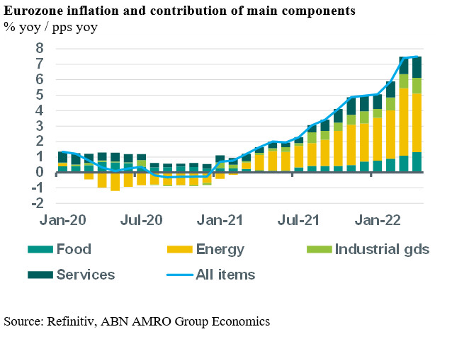 Eurozone inflation rose from 7.4% in March to 7.5% in April. The rise occurred despite a fall in energy price inflation (from 44.5% in March to 38.0% in April), which was due to wide-spread cuts in excise duties and taxes on car fuel that were implemented in most eurozone countries around mid-March. Still, the downward impact of energy inflation on headline inflation was more than eliminated by rises in food price inflation (unprocessed food price inflation from 7.8% to 9.2% and processed from 4.1% to 5.5%) as well as a further increase in core inflation (from 2.9% to 3.5%). The rise in core inflation was a combined result of higher non-energy industrial goods price inflation and higher services price inflation.