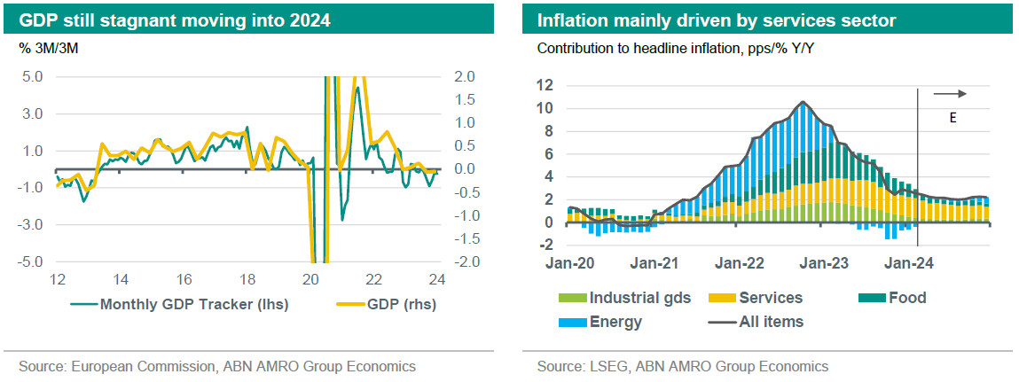Disinflation has continued in the first months of 2024. Headline inflation declined to 2.6% in February, down from 2.8% in January and core inflation decreased to 3.1% from 3.3%. The details show that since the end of 2023, the largest drops were in food and non-energy industrial goods. Services inflation stabilised in January and February 2024 (at 4.0%) and energy price inflation increased, although it remained negative (-3.7% yoy in February). Services is by far the biggest contributor to total inflation. Services inflation is mainly domestically driven and wage growth has a relatively big impact on price changes. Therefore, easing wage growth will be an important condition for services price inflation to ease. As we explain in a recent note (see here) wage growth in the eurozone has already peaked and we expect it to continue to decline in the coming quarters. Moreover, ongoing weak (services) consumption growth is limiting the room for price rises. All in all, we expect headline and core inflation to continue to decline in the coming months, approaching the ECB’s 2% target around the middle of the year.