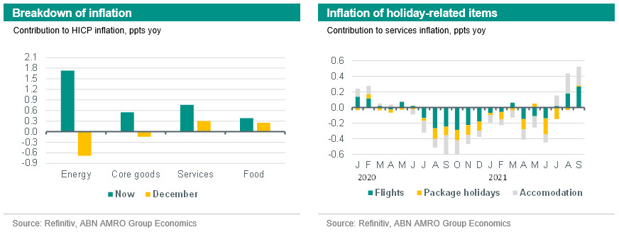 Energy, taxes, surging factory gate prices and a normalisation of holiday prices explain the acceleration of eurozone inflation. Inflation is likely to accelerate further, but it should fall sharply from the start of next year as factors currently driving higher inflation should dissipate, while wage growth is still subdued. Inflation should end up comfortably below 2% by the end of next year and in 2023.