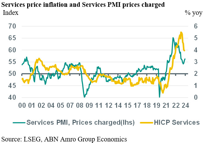 Turning to the price components of the PMI, both the input and the output price component of the composite PMI increased in January. Although the input and output price components of the manufacturing PMI hardly changed in January and remained well below the 50-level that separates a rise in prices from a fall in prices, the input price component of the services PMI increased by 1.3 points to 62.8 and the output price component of the services PMI increased by 0.6 points to 56.2. As services prices are the most domestically driven part of inflation and wage growth has a relative big impact on services prices, we think that the rise in these price components of the PMI supports the view of the ECB Governing Council that it is too early to declare victory in their fight against inflation. Our base scenario is that the ECB will cut interest rates by 25bp in June.