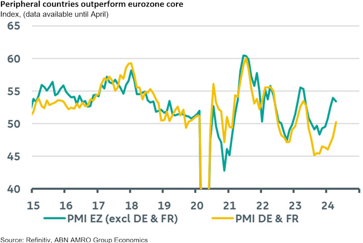 Looking at the major national indices, the May composite PMIs for France and Germany mean the divergence in activity between core and peripheral countries get a bit smaller, despite the pullback in the French composite PMI.
