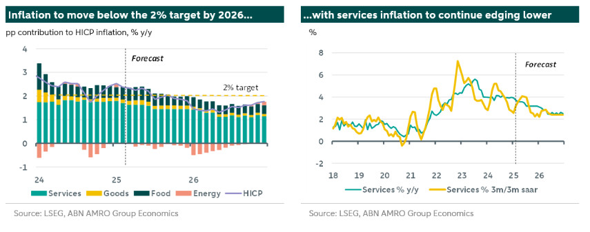 Finally, services inflation picked up a bit compared to last month, increasing to 4.6% y/y from 4.4%. Last month the breather in the CPI was mostly driven by declining services inflation (due to a lower annual indexation). In the coming months, we expect Dutch inflation to decrease, to 2.8% in 2025 and 2.5% in 2026. This is above our estimates for the broader eurozone and also exceeds the ECB’s 2% target. (Aggie van Huisseling)