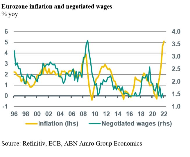 Besides food and energy price inflation, core inflation also moved higher on average, although the picture is quite mixed across countries and items. For instance, core inflation in France and Italy rose on the back of shifts in discounting in clothing and shoes a year ago. This will only have a temporary upward impact on inflation this year. However, France’s statistics bureau also mentioned that services inflation increased (to 2.2% from 2.0%) due to a rise in transport services. This higher inflation rate of transport services probably is a second round effect of the rise in energy price inflation in previous months. The rise in transport services inflation probably has further to go and will continue to have an upward effect on services inflation in the coming months. Another factor that currently is lifting services inflation, is the ongoing normalisation of holiday and leisure related prices following the lifting of restrictions. We expect this part of services inflation to remain elevated until around the middle of the year and subsequently fall during the rest of the year. As a result, core inflation should remain well above 2% in the first half of the year.