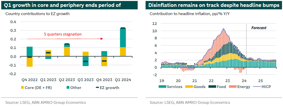 Q1 GDP (+0.3% qoq) surprised to the upside. We raise our 2024 GDP forecast from 0.4% to 0.7%. Growth is expected to remain slightly positive in Q2 as the outlook improves further, but remain below the trend rate. Disinflation in the eurozone is still on track, but services inflation remains firm due to high wage growth. The first rate cut by the ECB looks to be a done deal next week on 6 June, with attention shifting already to the pace of rate cuts that is likely to follow.
