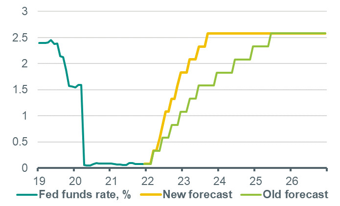 As widely expected, the Fed raised the target range for the fed funds rate by 25bp yesterday, to 0.25-50% – the first rise in rates since 2018. In addition, the Fed signalled a much steeper path for the fed funds rate over the coming two years, with the median FOMC member now expecting a total of seven rate hikes this year, and a further four rate hikes next year. While this brings the Fed’s projections much closer to our above-consensus expectation of seven 2022 hikes and three 2023 hikes, we did not expect the Committee to signal quite such an aggressive path for rates at this stage, which points to the fed funds rate rising to 2.8%, around 30bp above the estimate of neutral (2.5%) by next year. Indeed, the new projections appeared to surprise financial markets, with Treasury yields initially jumping around 6bp following their publication. Alongside new rates projections, the Committee made a significant downgrade to its 2022 growth forecast relative to December projections, to 2.8% from 4.0% (Q4/Q4), which Chair Powell attributed largely to the impact of the Russia-Ukraine conflict (this is at the weak end of our estimate of the hit to the US economy, although it probably incorporates some backward-looking downward revisions as well). The Committee also made another major upgrade to its PCE inflation forecast, to 4.3% from 2.6%, and signalled increased concern about the medium term inflation outlook by also raising forecasts for 2023 (+0.4pp to 2.7%) and 2024 (+0.2% to 2.3%).