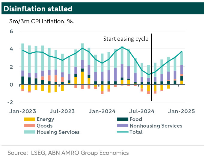 Following the upside surprise in January CPI inflation, we no longer think inflation can come down sufficiently to allow the Fed to ease before tariff policy starts to push up inflation in the second half of the year. The most likely response to the combination of still elevated inflation - with significant upside risk on the horizon - and a relatively resilient labour market, is to keep rates on hold indefinitely. In addition to the downward pressure these restrictive rates continue to exert on inflation, keeping rates steady also minimizes the risk of the Fed having to reverse any further easing in response to inflationary Trump policy, making it a less confrontational path from a political perspective.