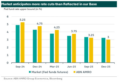 The overall risk to the Fed path is certainly on the upside. It is unlikely that the inflation readings will be so high as to keep rates steady. Rather, a worrisome labour reading may push the Fed to immediately cut by 50bp to accelerate the path to neutral. If the data comes in line with our expectations, the 25bp cut would probably be most appropriate. In such a scenario, a 50bp cut might actually worry markets more, seeing an urgency at the Fed after merely calling the developments in the labour market a ‘normalization’ in July. A high initial cut also sets expectations for the speed of rate cuts in the remainder of the path, which would have to be carefully managed.