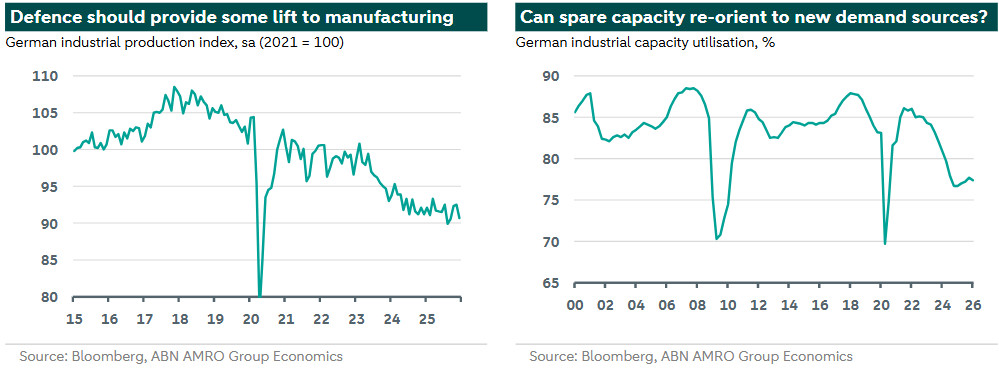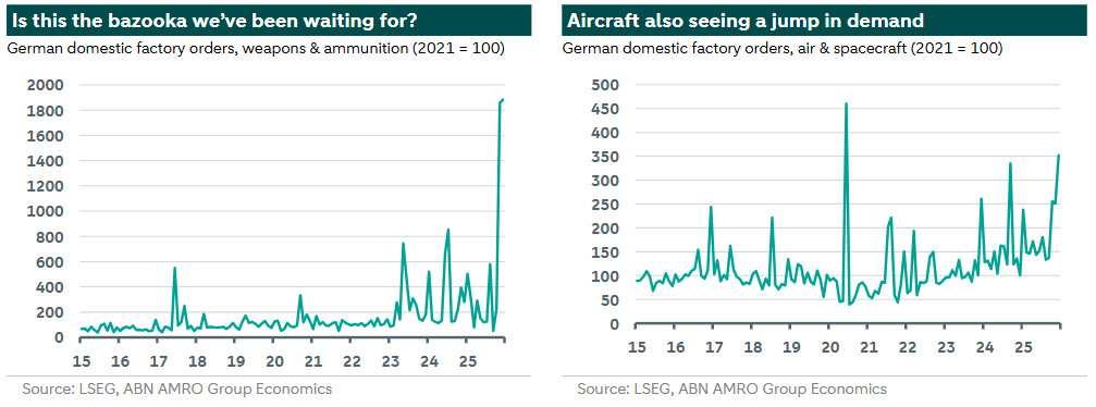 Defence spending is surging, according to monthly government spending data. The spending jump is now visible in factory order data, with the recent strength driven primarily by weapons and aircraft orders. Defence spending is likely to provide a cyclical tailwind to industry. But it will not be a saviour by itself given structural headwinds. A key uncertainty remains how quickly spare capacity in German industry can retool to new sources of demand.