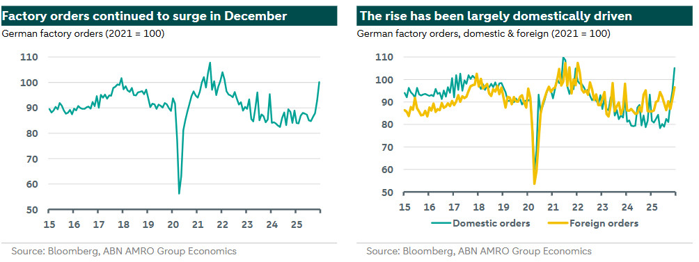 How is this spending manifesting in the real economy? The clearest signs are in German factory order data. Orders unexpectedly strengthened further in December following a jump in November, with orders growth accelerating to 13% y/yfrom 10.6% in November. The details showed that, although a rise in foreign orders contributed, the surge was largely domestically driven.