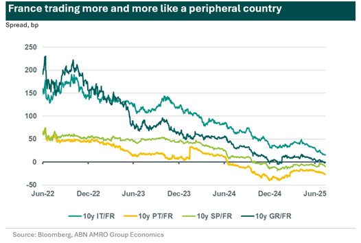 As a result, we maintain our view that the risk of a government collapse and subsequent legislative elections remains high, reinforcing our bearish outlook on France. The country faces significant political constraints that impede the implementation of structural reforms necessary to consistently reduce government spending and, consequently, its public deficit. Thus, we expect French bonds to underperform compared to other EGBs. Over the past year, French bond yields traded closer and closer to peripheral bond yields, trading even higher now than Spain and Portugal (as shown below). This is clearly reflecting the country’s deteriorating fiscal outlook and political fragmentation. And based on current political reaction following this new budget, it is clearly not of the woods and is set to remain exposed to political shock and volatility in the coming months.