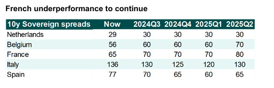 Looking further forward, a new legislative election likely next year, due to the absence of a majority by any political party, could lead to a new flare up of tensions. We therefore expect country spreads to widen again as we approach the second quarter of 2025, when a dissolution of the assembly is likely to be announced once more, triggering a new round of political risk.