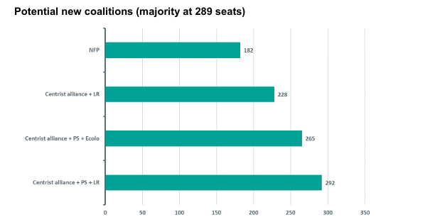 Based on the new composition of parliament, only one credible coalition emerges, which is a Centrist alliance extending to the Socialist Party (PS) and the conservatives (Les Républicains). However, while this coalition may gather enough seats to achieve an absolute majority, it will require nearly unanimous support from each party, which appears uncertain at the moment. In addition, it is doubtful whether PS would work with LR. Another coalition is unlikely, as it would necessitate an alliance with one of the radical parties (RN or LFI), a prospect that was already rejected by their political leaders last night.