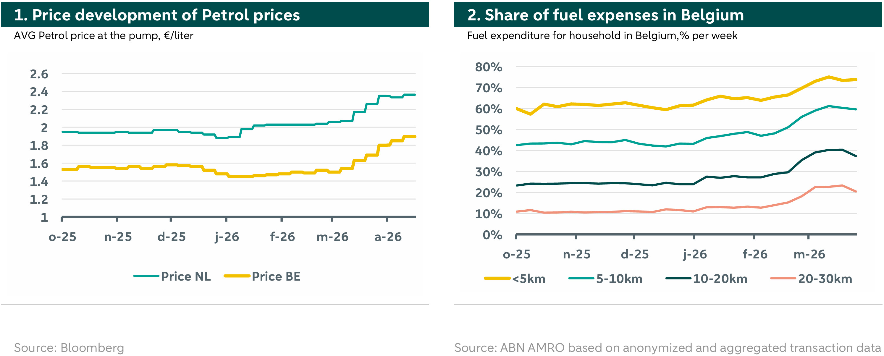 The war in Iran has global economic consequences. For example, the war leads to increased uncertainty, higher inflation, and lower GDP growth in the Netherlands (see here). The first effects of the war are especially noticeable for Dutch consumers in energy prices. The global oil market is reacting strongly to the conflict, partly because of the closure of the Strait of Hormuz and damage to key oil installations in the Gulf region. As a result, the price for a barrel of Brent crude oil has lingered around $100 for weeks. This increase quickly translates to the pump, where the average price for a liter of E10 gasoline has risen from about EUR 1.90 to nearly EUR 2.40 (see Figure 1). Gasoline prices in Belgium are up to 55 cents lower. This is mainly due to lower excise duties and a government-set maximum price. For an average Dutch car, this saves about EUR 25 to EUR 30 per full tank. Because of the significant price difference and rising prices, more and more border residents are choosing to fill up in Belgium (see Figure 2). This increase in 'fuel tourism' is once again fueling the debate in the media and politics about cross-border refueling and tax reductions. Since Germany announced a temporary reduction in excise duties on gasoline and diesel last week, it is conceivable that the same phenomenon will soon occur at the German border. Especially now that the cabinet, in the recently presented support package, has opted for other forms of support instead of direct reductions at the pump.