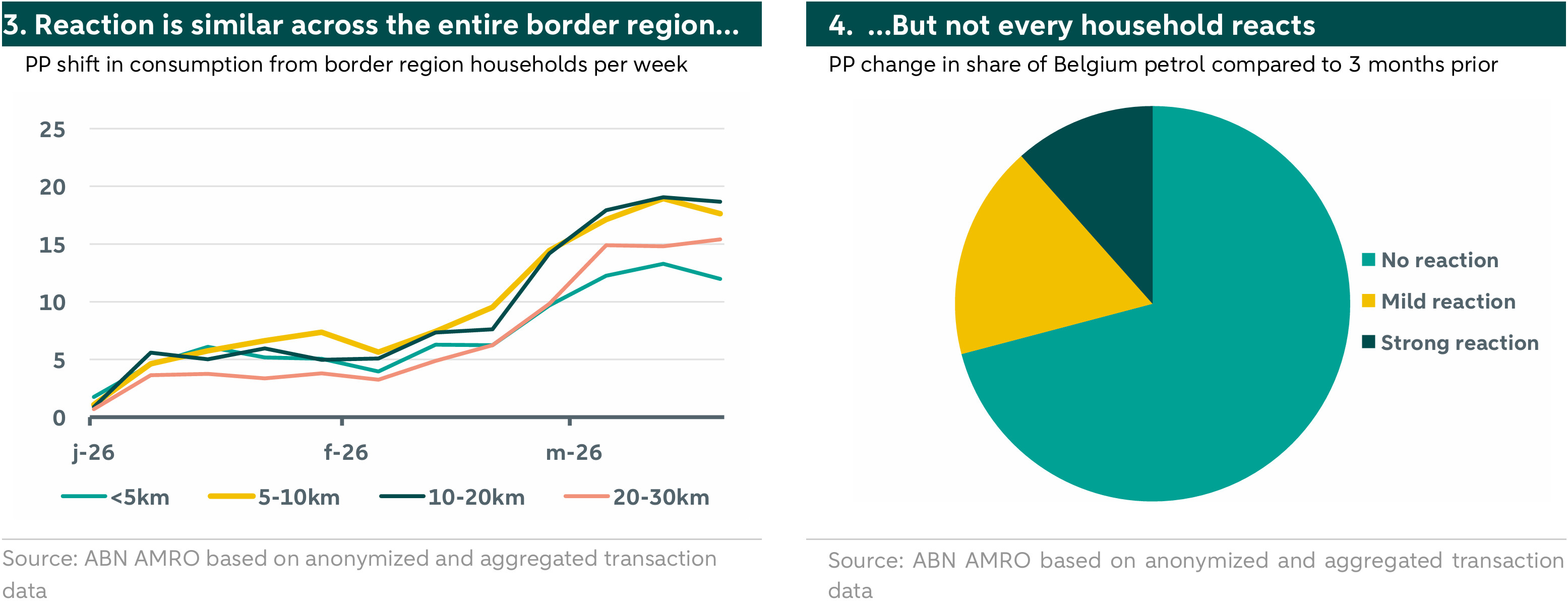 Starting in January, these households began buying about 5 percent more gasoline in Belgium (Figure 3). When the war in Iran broke out, all groups added another 10 percentage points. This effect is similar regardless of the distance to the border. In total, this means households now fill up about 4 to 5 extra liters per week in Belgium.