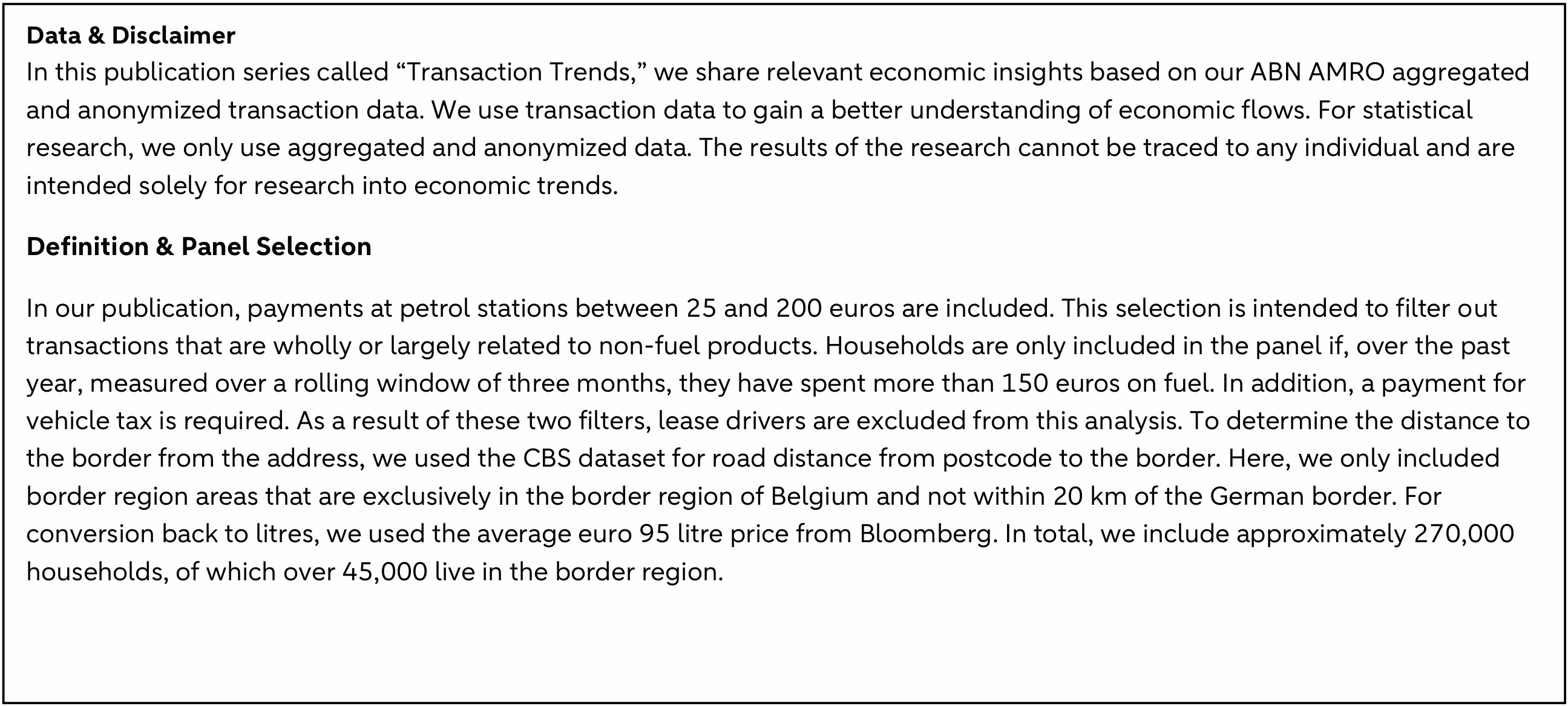 To gain a clear picture of fuel tourism along the Belgian border, we use anonymized and aggregated transaction data to examine fuel spending by households in the border region. We look at how different groups, from people living just 5 kilometers to as far as 30 kilometers from the border, adjust their refueling behavior in response to fuel price differences. We do this by determining in which country these households make their transactions at the pump. To avoid including unrelated purchases at gas stations, we only consider transactions between EUR 25 and EUR 200. In addition, these households must spend at least EUR 150 on fuel every three months and must pay road tax. We do this to ensure we only include households that actively use their car. To estimate the number of liters refueled based on the transaction amount, we convert this back to liters using the weekly average price per liter for E10 in the country of purchase [1].